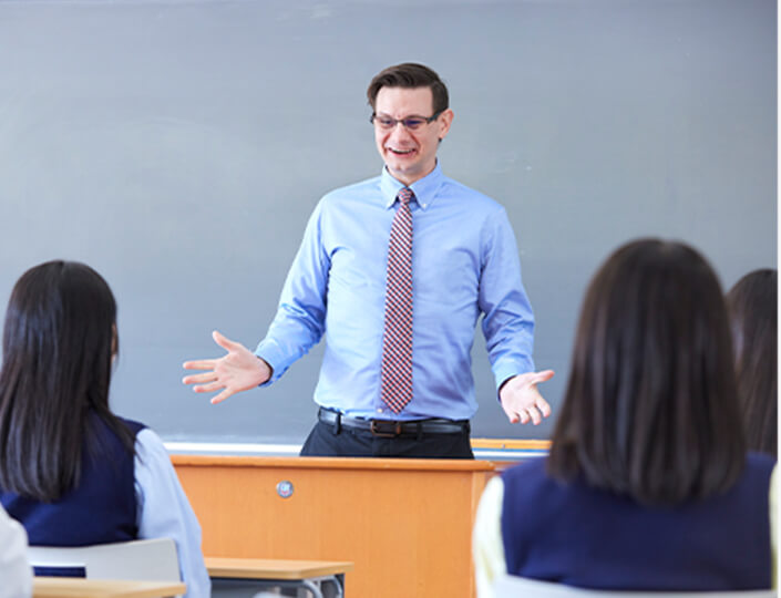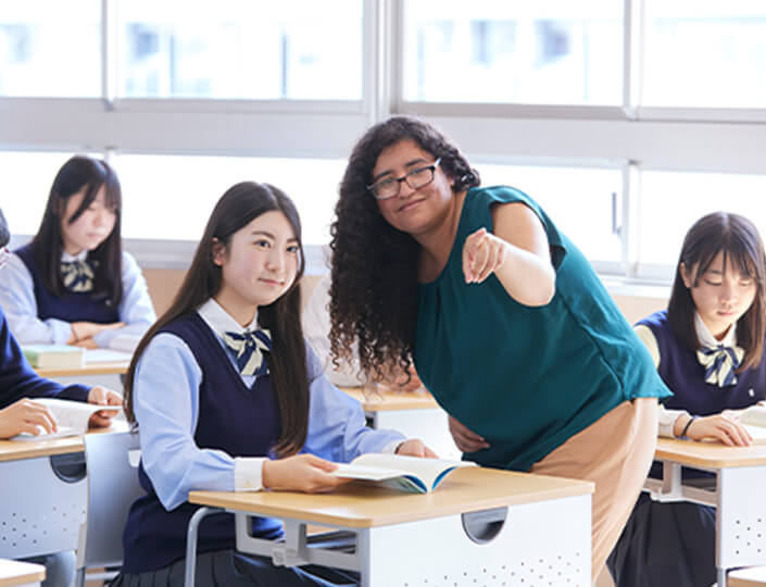 2週間に1度、各クラスにネイティブ教員が入りオールイングリッシュでHRを実施します。授業や課外活動だけで英語に触れるのではなく、普段の生活からネイティブとの英会話によるコミュニケーションに親しむことで英語でのアウトプットを促進します。英語を”教科”として取り組むと苦手意識を感じてしまう原因につながりやすいですが、会話を楽しむための”手段”として捉えることで、積極的に学ぶ意識を醸成していきます。