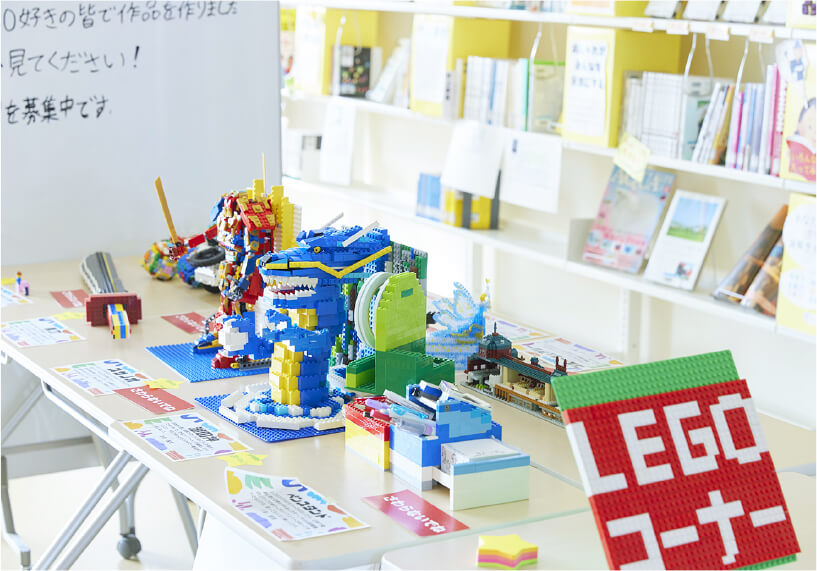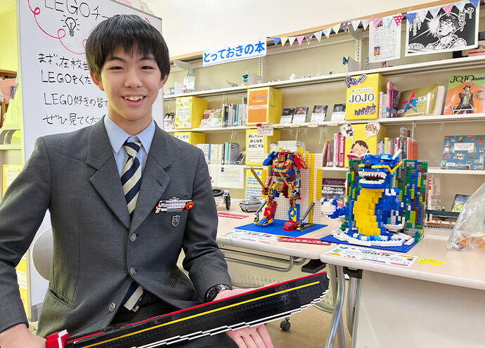 LEGO®が好きで個人で楽しんでいたところ、図書館が発行している「com+com通信」に「図書館にLEGO®コーナーをつくりたいので手伝ってくれる生徒募集中!」という記事があり、「それはもう僕しかいないでしょう!!」と、その日のうちに立候補しました。コーナーを設置する位置や備品の調達など、先生たちに相談しながらつくりあげた日々はとても楽しく貴重な経験になりました。