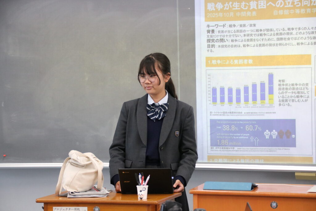 浅井さんは「貧困を“かわいそう”で終わらせず、正しく理解することが大切」と語り、SNSや学校での発表を通して、自らの学びや感じたことを積極的に発信しています。写真は今年度の探究発表会で「戦争が生む貧困への立ち向かい方」というタイトルで発表している浅井さんの様子です。